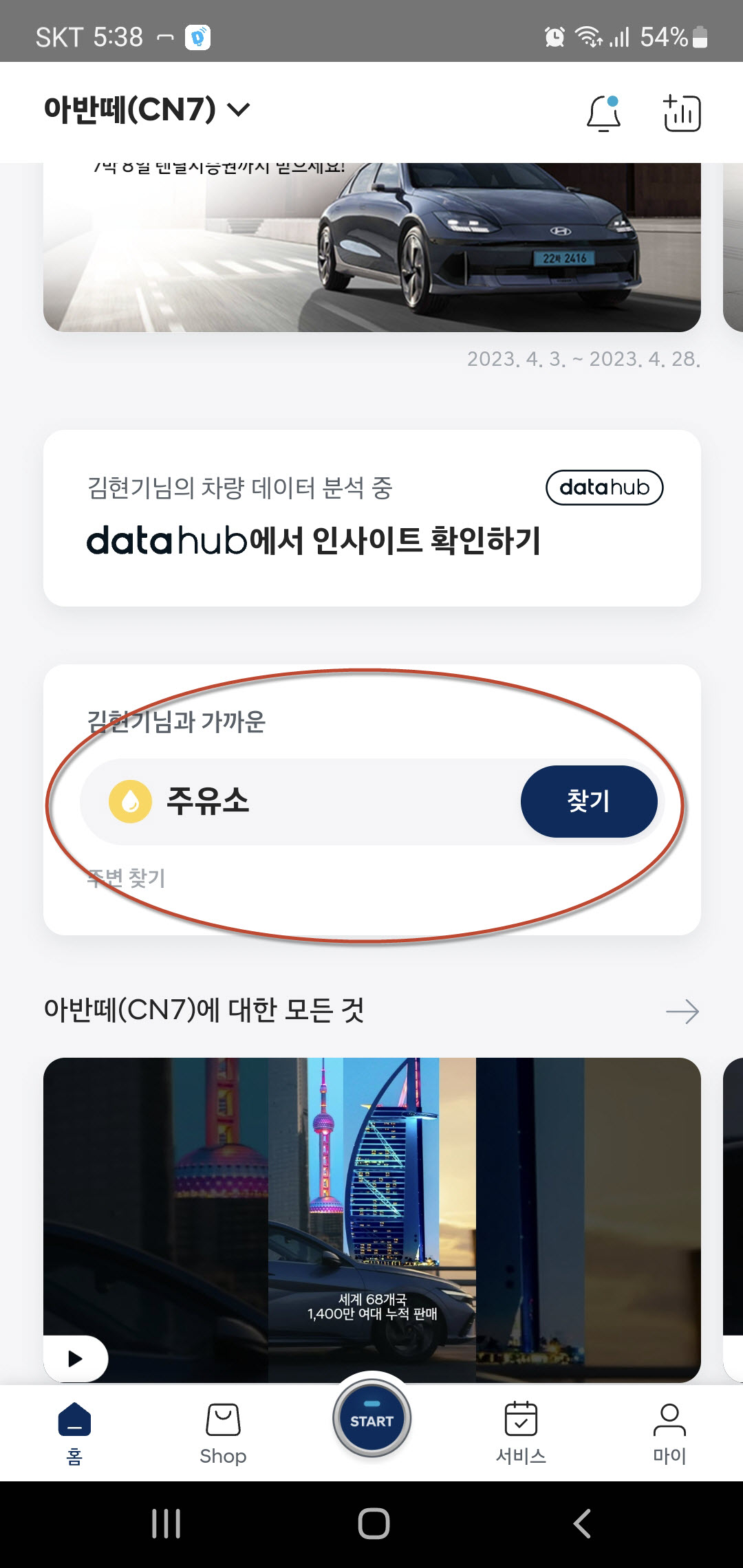 "마이현대" 어플의 홈화면에서 좀 내리면 주유소or충전소 찾기 메뉴가 보이면 선택한다.