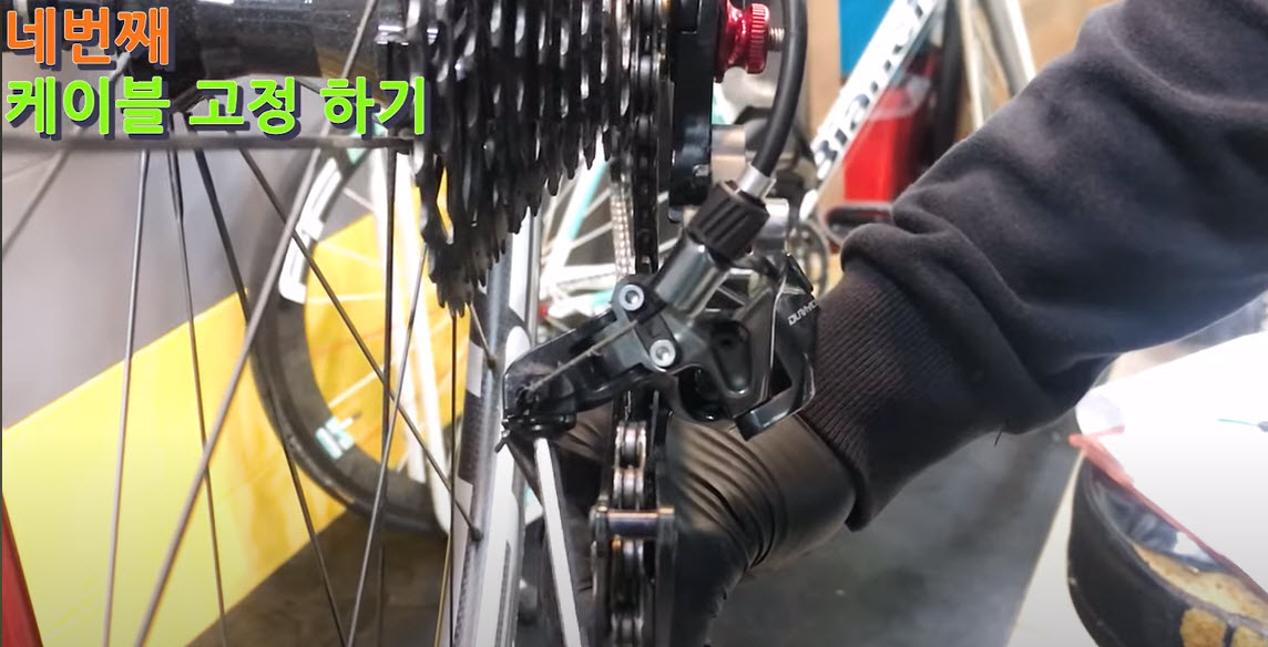 쉬프터에서 최고단기어인지 확인하고 살짝 팽팽하게 당긴후 조인다.
